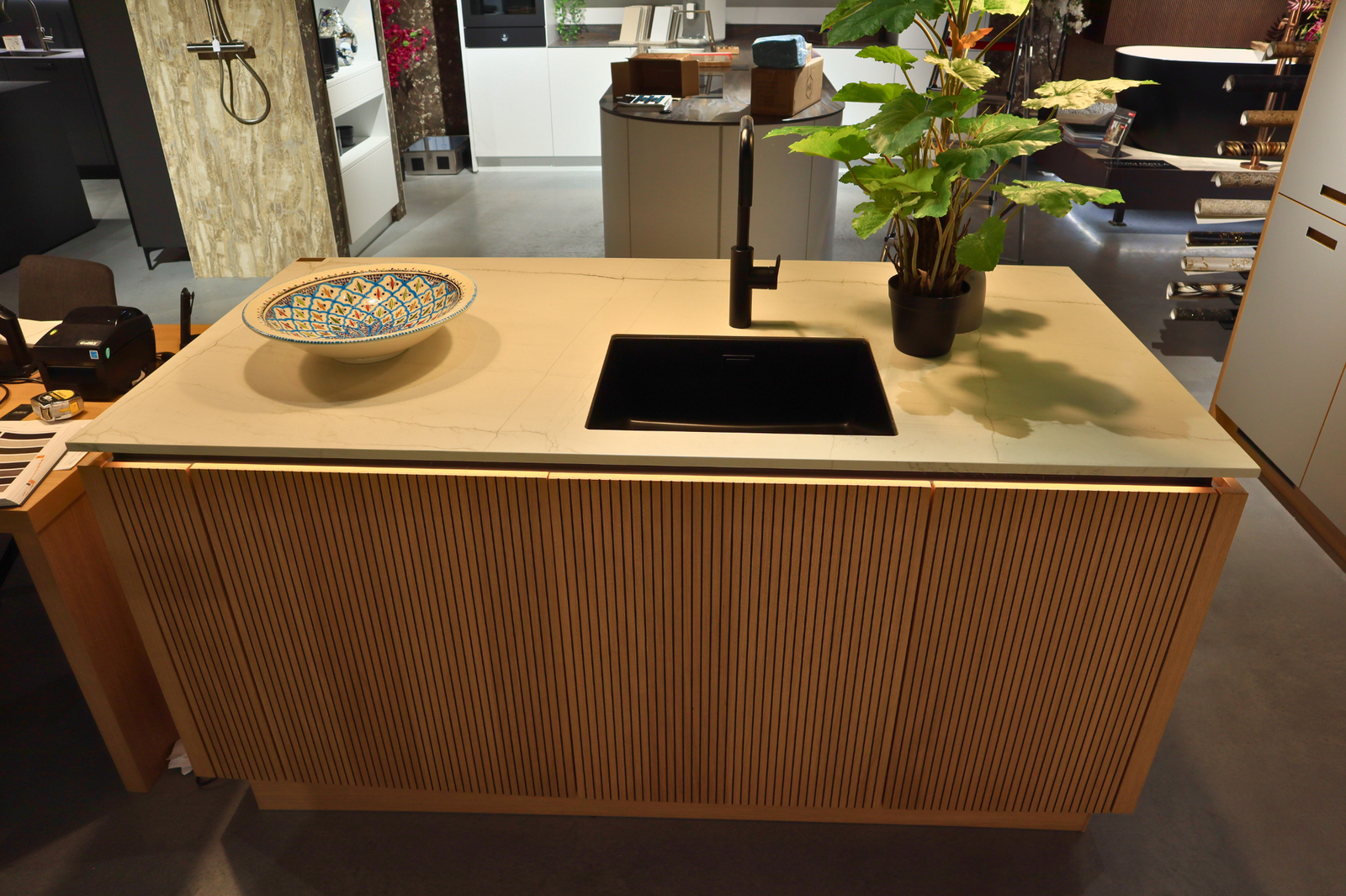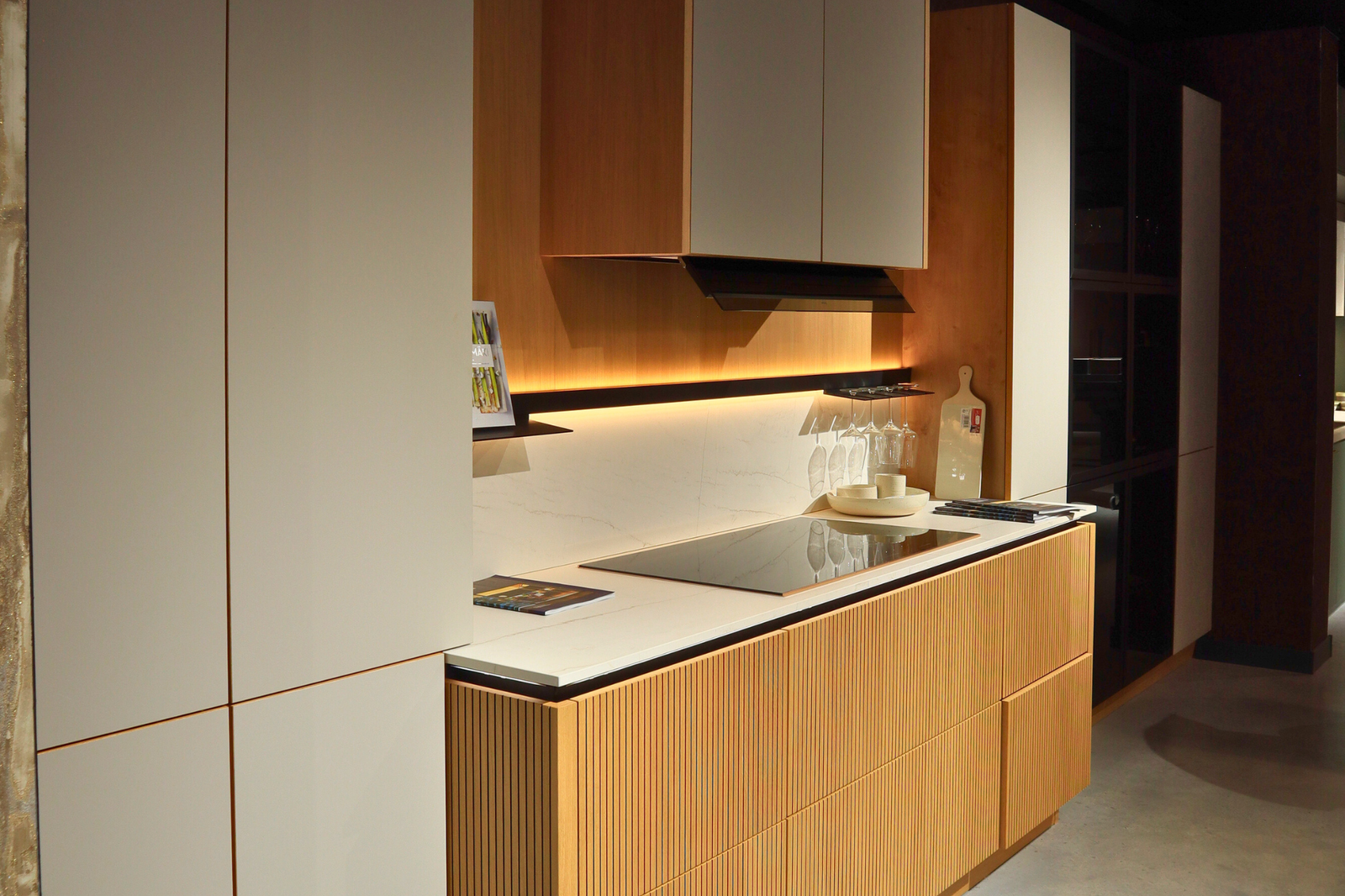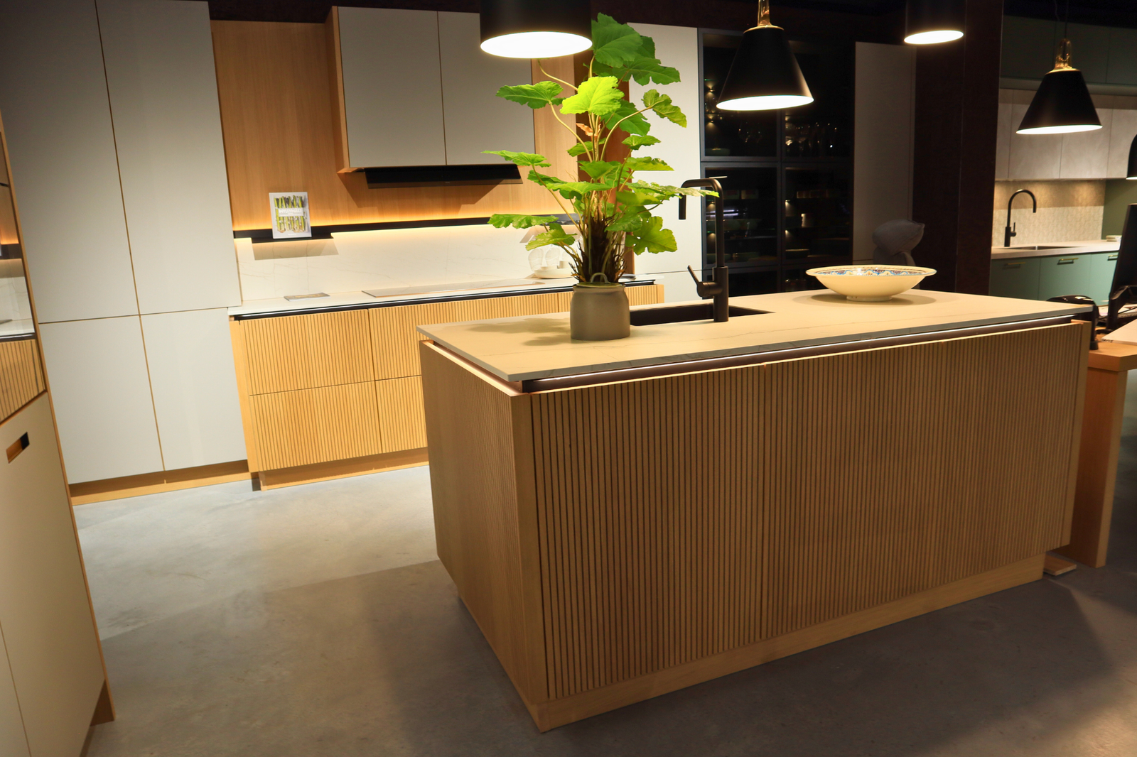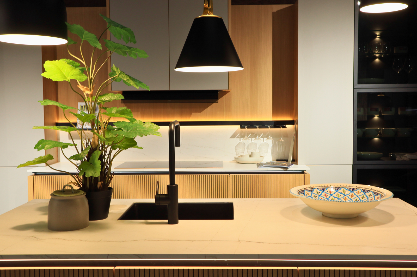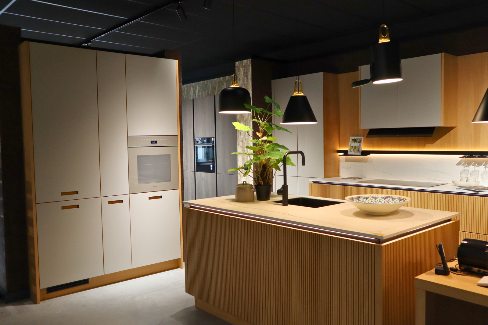 De verticale houtstructuur van het eiland geeft diepte en karakter, terwijl de subtiele LED-verlichting onder het werkblad een elegant, bijna hotelachtig gevoel creëert. De lichte werkbladen versterken het ruimtelijke effect en vormen een prachtig contrast met de zwarte accenten, zoals de kraan en de design hanglampen.