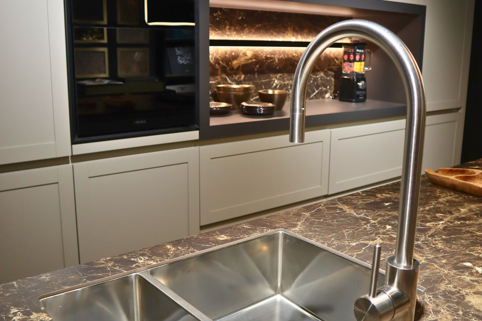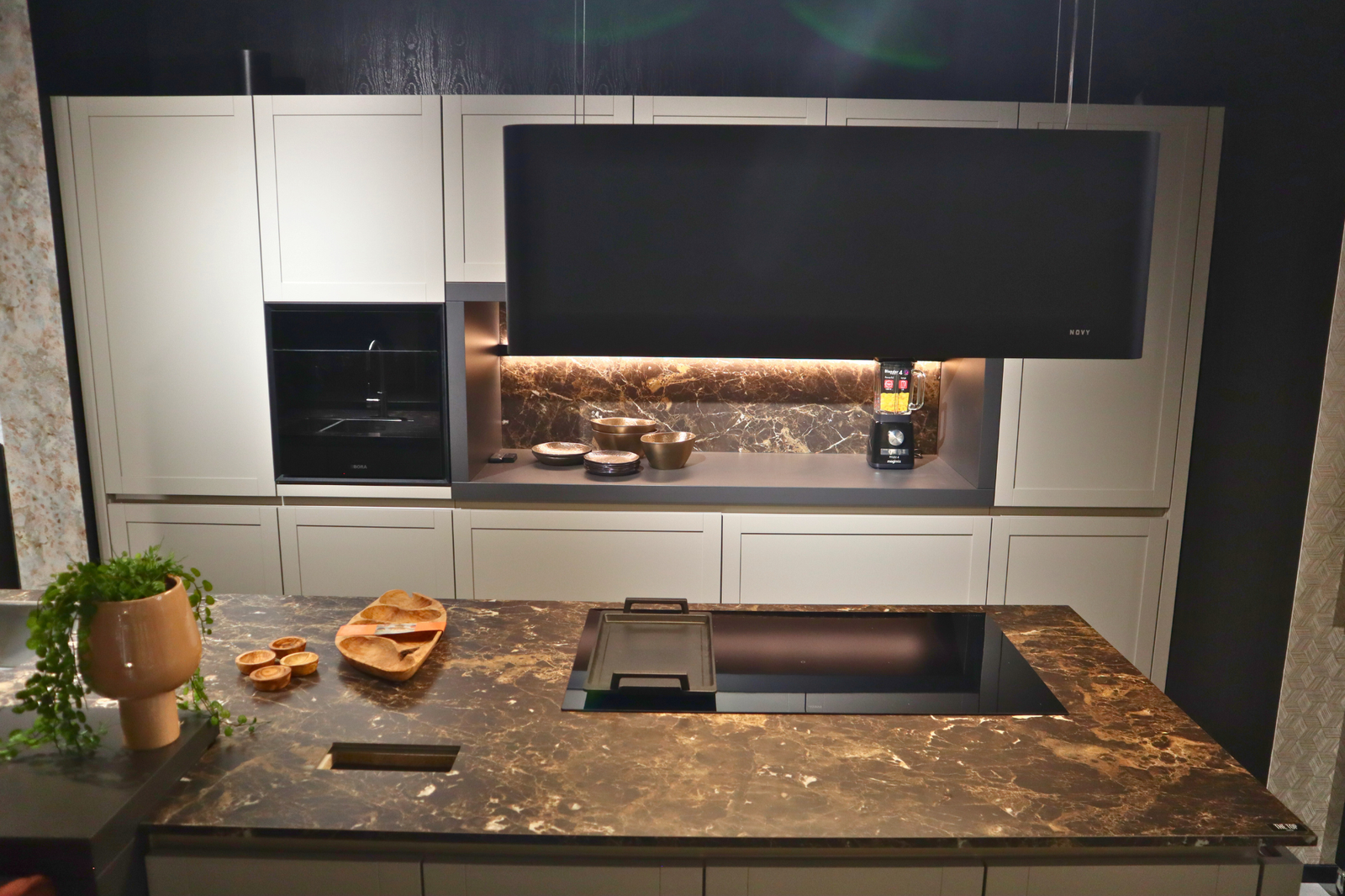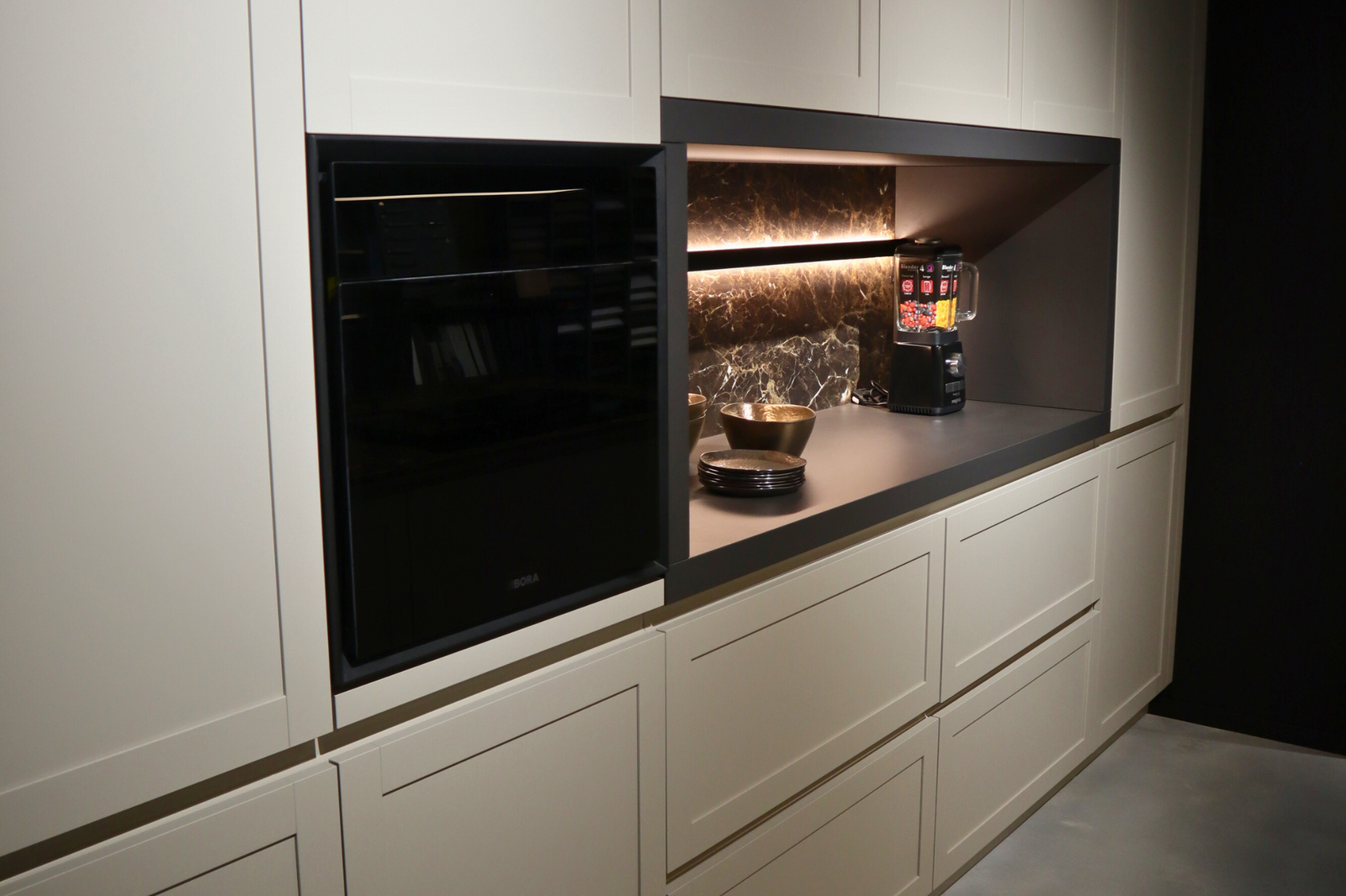 Deze showroomkeuken laat zien hoe modern design en warme elegantie elkaar versterken. De rustige, matte kastenwand vormt een tijdloos canvas, terwijl het donkere kookeiland met natuursteenlook direct karakter en diepte toevoegt. Een keuken met uitstraling — zonder schreeuwerig te zijn.